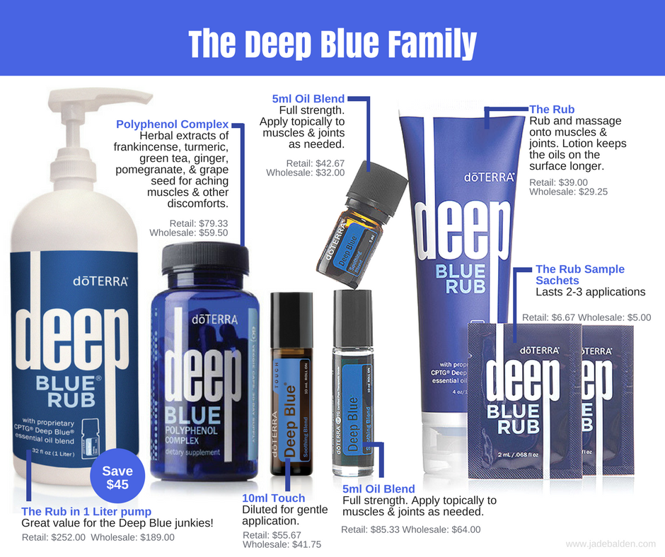 - Deep Blue Rub: Typically producing a wonderful icy/hot sensation on the skin, Deep Blue Rub is the perfect companion for your active lifestyle. The non-greasy formula makes it a wonderful massage lotion for exhausted muscles, delivering the soothing Deep Blue essential oil blend right where you need it. Use it after a long day on your feet, before your nest yoga class, or when you feel stiff after a particularly tough workout. Be cautious using this blend directly after a shower though as open pores will intensify its effects.