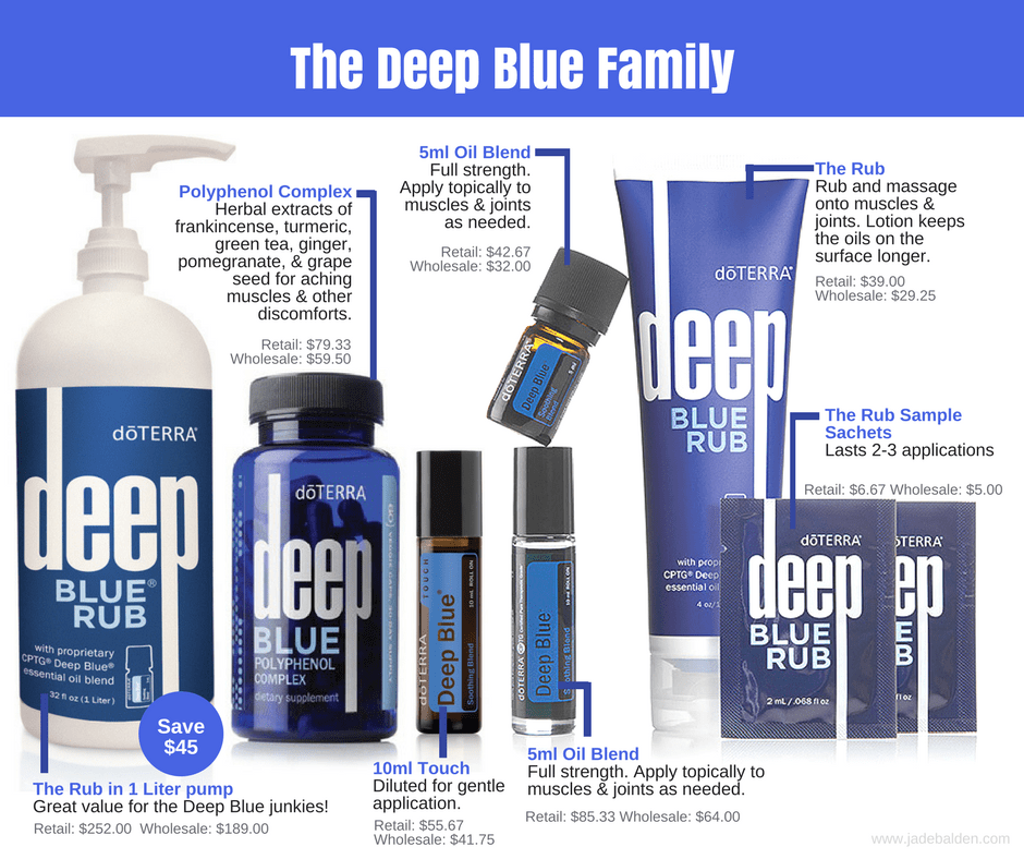 - doTERRa Deep Blue Touch: Deep Blue is a powerful blend, and as such, should be diluted for sensitive skin or before applying on children. The pre-diluted doTERRA Deep Blue Touch is a convenient option for children. Keep it on hand after sports practices, or rub it on a growing child’s legs before bedtime.
