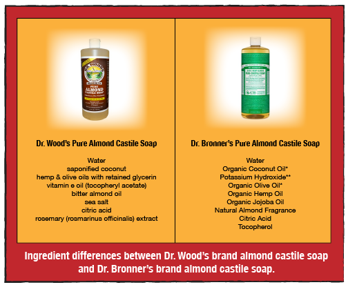 I have traditionally used Dr. Bronner’s Liquid Castile soap for all my recipes mostly because that was what seemed most highly recommended by trusted specialists and also because it was the most readily available for me at my local store. However, I decided to branch out one afternoon when I was tipped off that my favorite castile soap (almond) was for sale on amazon under a different brand name (Dr. Wood’s) for a much less expensive price than the Dr. Bronner’s brand. So I thought, “why not! Let’s give it a try!”.